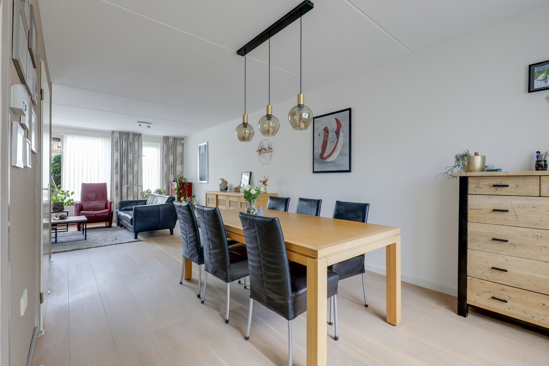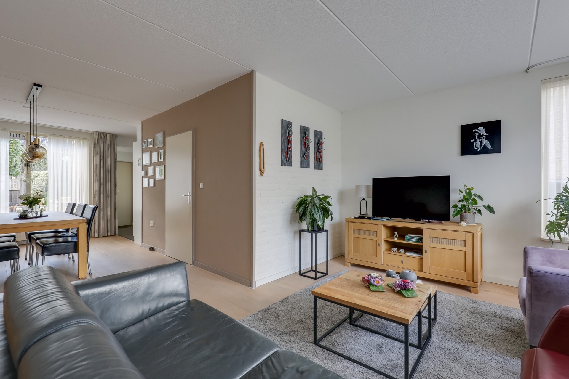 Bij binnenkomst is er een hal, toilet met fonteintje, garderobe, meterkast en een spiltrap naar de eerste verdieping. De woonkamer in L-vorm is ruim, licht en is voorzien van een eiken laminaatvloer en screens.