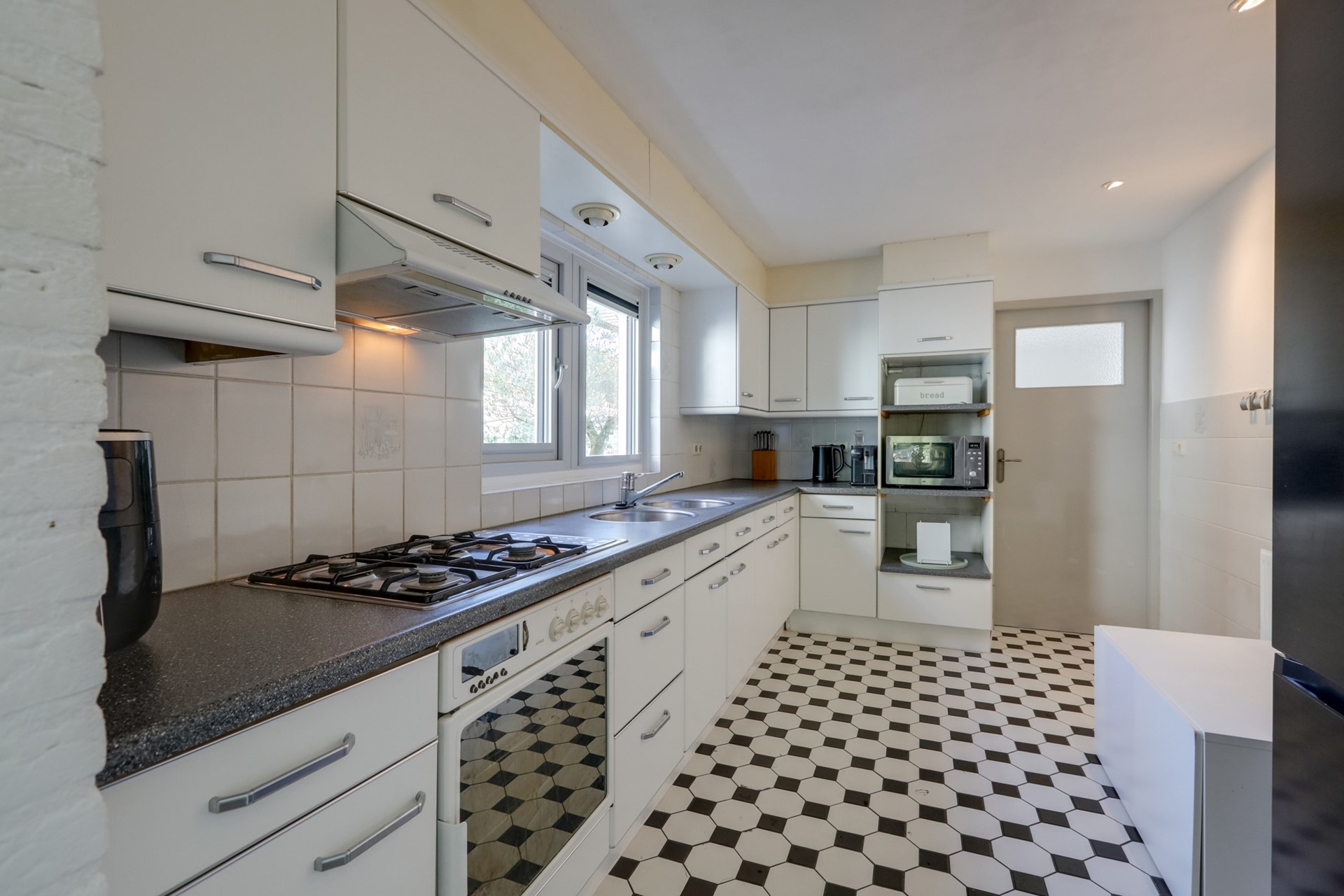 De keuken is functioneel uitgerust en biedt directe doorgang naar de bijkeuken. Hierin vind je een toilet en witgoedaansluitingen. Aan de bijkeuken grenst een royale werkkamer die ook kan dienen als slaapkamer of speelkamer voor de kinderen. Deze ruimte is voorzien van bergruimte, houten kozijnen met dubbel glas en rolluiken.
